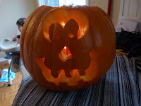 Notre citrouille est taillée. Trois visages sur une seule citrouille! On n’arrivait pas à se décider alors on va simplement la tourner. Même la chandelle a été testée. Et malgré le fait que je sois la seule à avoir eu le privilège d’évider la chair de citrouille…, on a bien rigolé. Moi qui croyais que de laisser mes enfants jouer dans la giblote de citrouille leur ferait plaisirs.... Il semblerait que de regarder maman faire le travaille soit beaucoup plus amusant! :-)